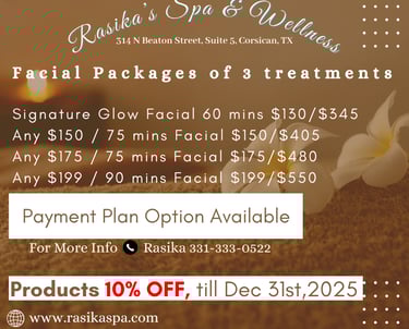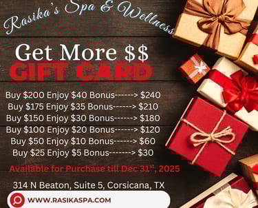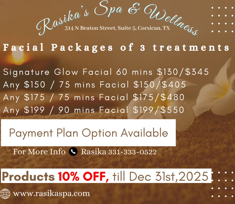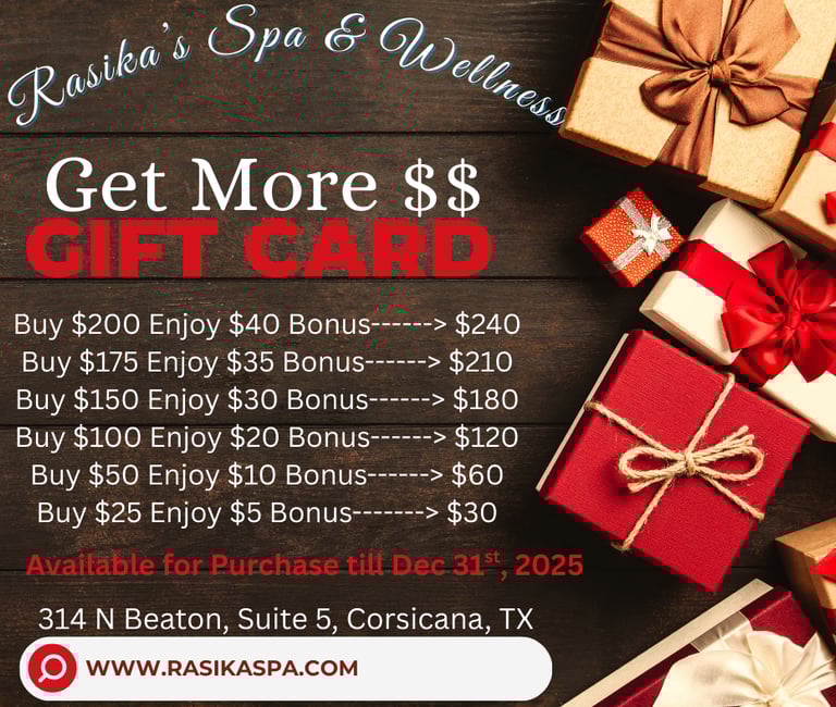 Located in the heart of Corsicana, Texas, Rasika's Spa & Wellness is your sanctuary for relaxation, healing, and rejuvenation. We specialize in holistic therapies and beauty treatments designed to restore balance to your body, mind, and spirit.
